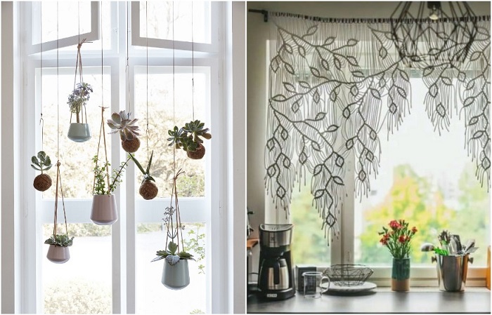 Отказавшись от штор, в квартиру можно будет добавить индивидуальности. В этом помогут изделия, сделанные своими руками. Если вы или ваши друзья увлекаются хендмейдом, займитесь созданием гирлянды из фотографий или фигурок, подвешенных на нитках. Также очень красиво и свежо смотрятся висячие емкости с маленькими растениями – для того, чтобы их сделать, понадобится только бечевка и деревянные подставки под горшки. Такое решение очень красивое, оригинальное и дарит прекрасное настроение.