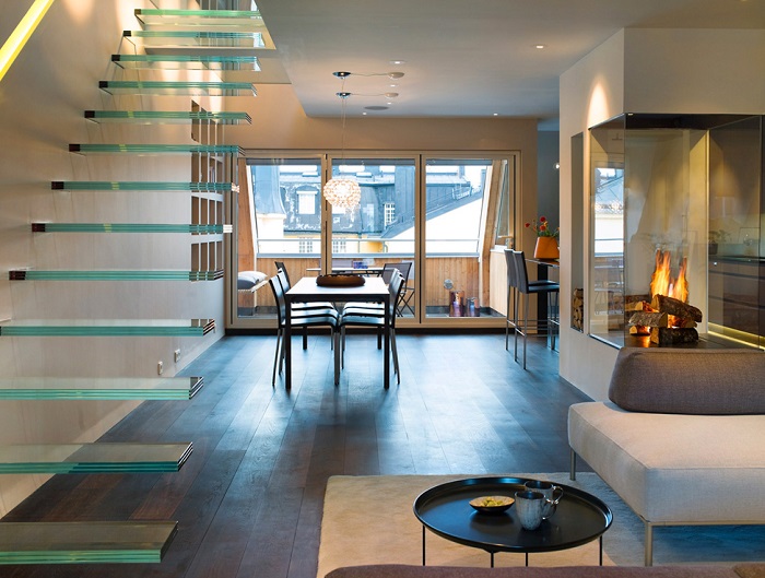 Больше всего возможностей создать эффектный интерьер будет у владельцев двухэтажных частных домов. Они смогут построить у себя дома опасную, но от того еще более привлекательную лестницу с навесными ступенями – это интерьерное решение является одним из самых захватывающих, если говорить о предметах, которые «парят в воздухе». Чаще всего такие лестницы предполагают стеклянные перила – подобное ограждение выполняет роль своеобразной опоры для «зависших» ступеней. Но фанаты адреналина могут пойти еще дальше и оставить конструкцию полностью открытой.