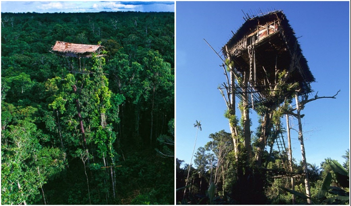 Папуасское племя короваи или колуфо, обитающее в Индонезии, до сих пор не видело цивилизации, и единственным способом спасения от хищных животных, соседних племен и злых духов они считают жизнь на деревьях. Люди этого племени с древних времен научились строить избушки на деревьях породы баньян. Они сначала срезают верхушки взрослого дерева, а затем с его же веток собирают стены и крыши, которые покрывают ветками. Чаще всего хижины расположены на высоте 10-15 метров, к которым очень трудно добраться, ведь с землей их соединяет хлипкая лестница, и подняться по ней не подготовленному человеку точно не удастся.