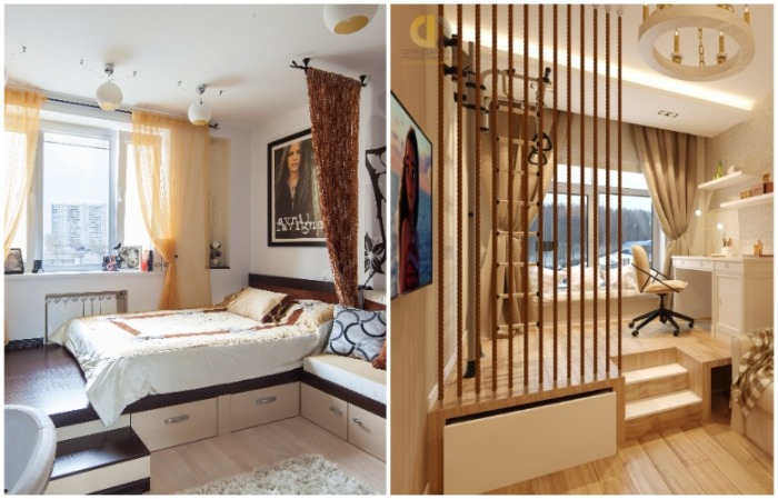 Для того, чтобы разделить комнату на зоны, совсем необязательно возводить глухие перегородки из гипсокартона. Можно просто изменить уровень пола. Даже если перепад высоты будет незначительным, все равно помещение перестанет восприниматься как одна комната. Самым оптимальным вариантом будет возвести подиум и расположить на нем кровать. Более четкого эффекта деления получится добиться, если продублировать перепад высоты пола таким же перепадом на потолке. Кстати, подиум можно использовать не только по прямому назначению, но также в качестве вместительной системы хранения. Разложите там постельное белье, сезонные вещи и пр.