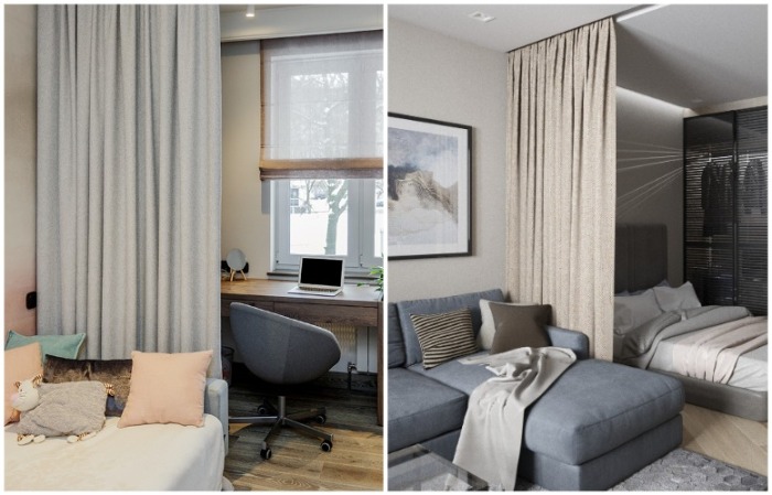 Если не хочется возводить никаких дополнительных конструкций, можете разделить комнату на несколько частей при помощи штор. В большинстве случаев занавес используют, когда нужно из одного помещения сделать спальню и гостиную.