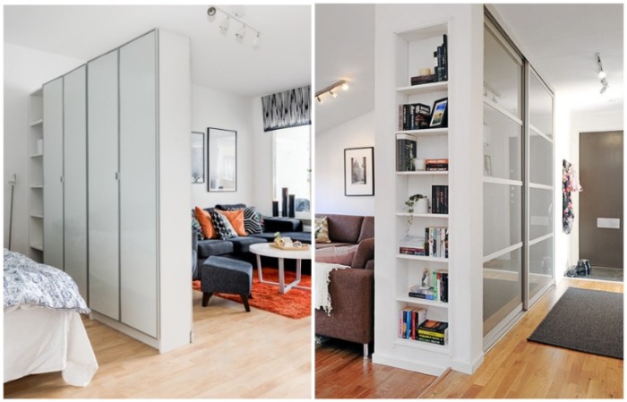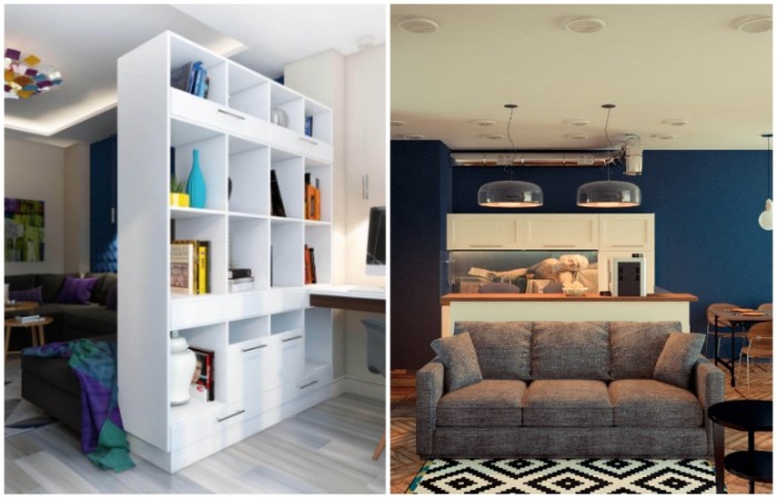 Прекрасными помощниками в вопросах зонирования пространства являются предметы мебели, в частности, стеллажи и диваны. Достаточно грамотно подойти к вопросу перестановки, и вы получите две комнаты вместо одной. При этом не нужно будет оплачивать ремонтные работы или тратить деньги на возведение дополнительных стен. Выбирайте стеллаж любой высоты, самое главное, чтобы он был открытый. Такая модель выглядит легче, воздушнее, не перегружает комнату и не препятствует попаданию солнечного света в ту часть помещения, которая оказывается отделенной от окна.