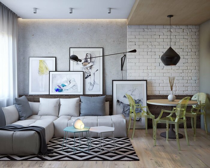 Выделите разными цветами и фактурами зону отдыха и обеденную. / Фото: pinterest.ru