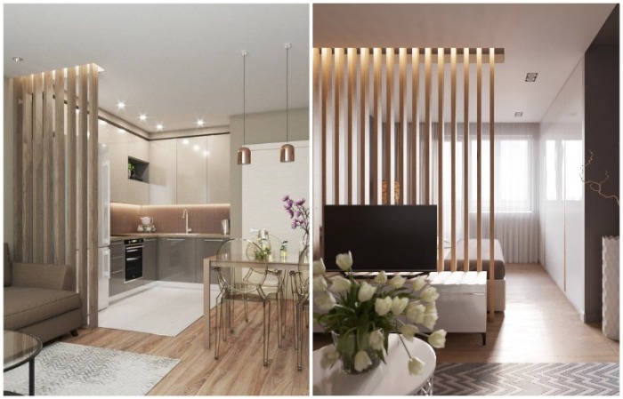 Еще один вариант, который используют дизайнеры для разделения одной комнаты на две – это перегородка, созданная из деревянных реек. Возможно, ее придется делать на заказ, но результат точно того стоит. От такой перегородки выиграет весь интерьер, ведь она визуально разделит помещение на зоны, но при этом не будет препятствовать попаданию солнечного света на оба участка комнаты и нарушать свободную циркуляцию воздуха. Есть еще несколько плюсов: деревянные изделия всегда делают пространство намного уютнее, органично вписываются практически в любой стиль интерьера и маскируют недостатки планировки.