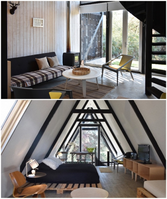 Сам домик может похвастаться просторной гостиной открытой планировки с настоящим камином, кухней-столовой, благоустроенной ванной комнатой и спальней на втором уровне. Отличительной чертой лесного дома является А-образная крыша и полностью стеклянная фасадная стена, благодаря которой отдых на природе будет действительно незабываемым.