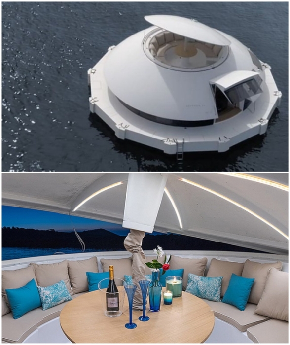 Интересный факт: Компания-изготовитель и сам автор проекта предлагают сразу несколько вариантов организации внутреннего пространства. Версии плавучих модулей могут варьироваться от гостиничных номеров класса «Люкс» с баром/рестораном и залов заседаний для деловых встреч, до романтических апартаментов с джакузи и круглой кроватью. Но в любой модели имеется еще и открывающийся люк с зоной отдыха на террасе.