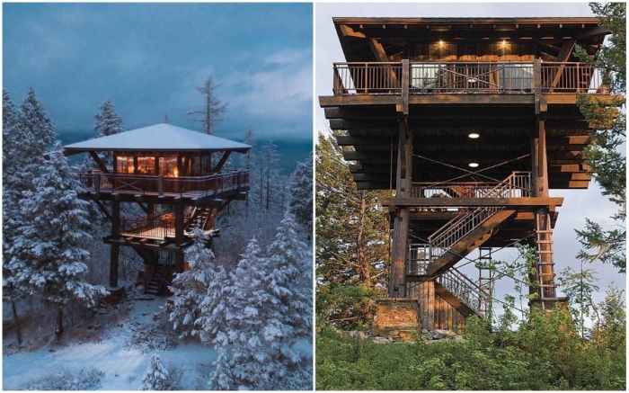 В былые времена среди лесной глуши, чаще всего на самой высокой точке, строились пожарные смотровые башни, на которых несли дозор специально нанятые люди. Сейчас от услуг пожарных дозорных уже отказались, а вот вышки остались и были благополучно выкуплены любителями отдыха в лесной глуши. И это немудрено, учитывая, какие виды открываются с высоты башен. По сведениям автором Novate.ru, почитатели уединенного времяпровождения настолько увлечены подобными строениями, что начинают строить загородные домики в таком стиле. Так, например, житель Уайтфиша, штат Монтана обратился к специалистам архитектурной компании MT-Creative Architects, которая и спроектировала точную копию пожарной смотровой башни на вершине лесистого склона.