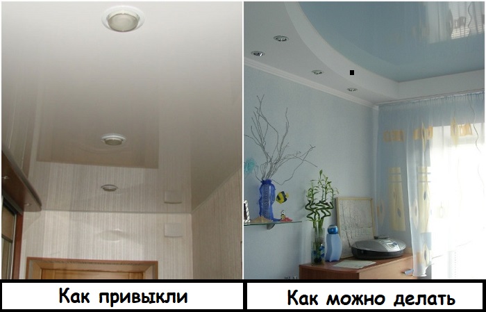 К такому решению часто прибегают владельцы хрущевок. В виду того, что их квартиры небольшие, они стараются всячески увеличивать их при помощи различных дизайнерских приемов. Самым популярным из них является использование белого цвета. Считается, что он зрительно приподнимает потолки, расширяет пространство, делает его легче и воздушнее. Это правда, ровно как и то, что любой светлый оттенок справляется с данными задачами. Вы смело можно делать потолок серым, бежевым, мятным, персиковым, нежно-голубым и так далее. Самое главное – подбирать цвет исходя из того, сколько солнечного света попадает через окна в вашу квартиру. Если мало – отдавайте предпочтение теплой цветовой гамме, если много – то холодной. Если потолок очень низкий, зайдите выбранным оттенком на стена примерно на 20-30 сантиметров. Таким хитрым способ вы сможете визуально увеличить высоту комнаты.