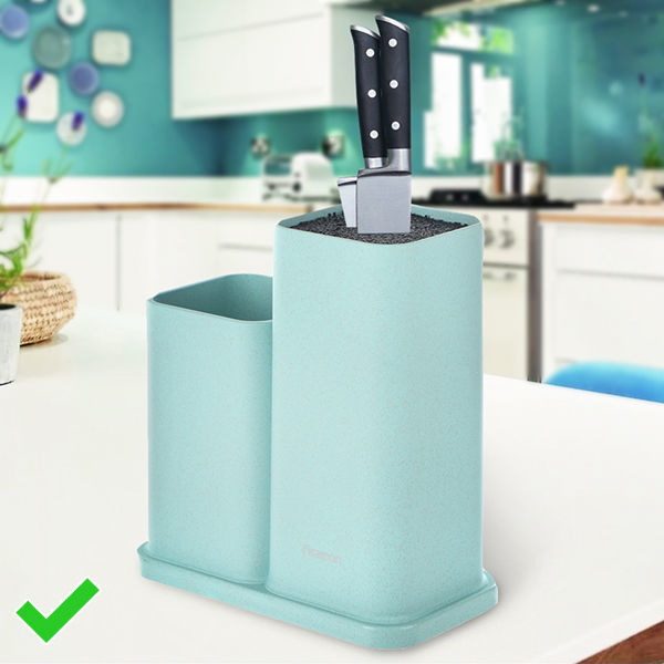 А вот в случае с ножами мы рискуем не только устроить на кухне беспорядок, но и испортить сами инструменты. От совместного хранения они быстро тупятся и портятся. Тут нам на помощь приходят разнообразные органайзеры. Самые эстетичные (хоть и спорные по безопасности) - магнитные ленты, закрепленные на стене. Не менее интересные — горизонтальные и вертикальные подставки-ёжики, где ножи защищены от прикосновения друг к другу.