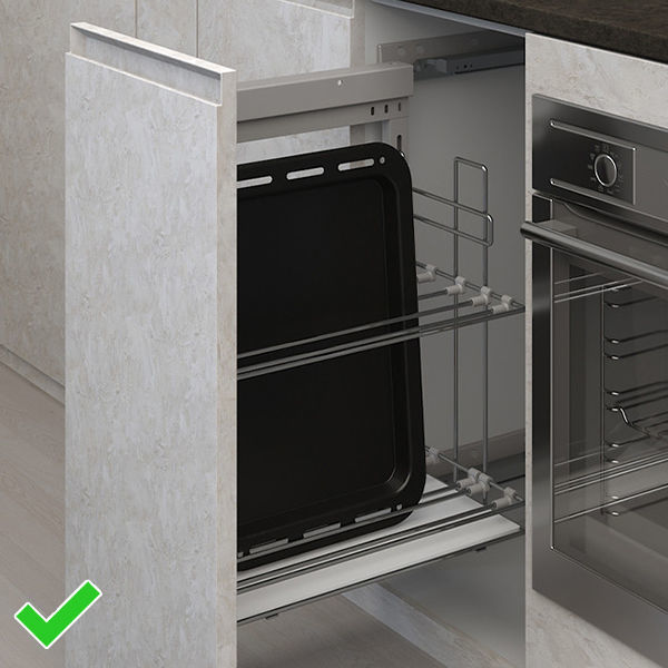 Раздражает, что, прежде чем использовать духовку, ее нужно освободить от кучи поддонов и противней? Желание одно: захлопнуть духовой шкаф поскорее! Но мы советуем остановиться. Устроить поудобнее ваши принадлежности для выпечки очень просто. Отведите для поддонов вертикальную полку с несколькими отсеками и рассортируйте все по размерам. Больше кулинария не вызовет раздражение. Нет вертикальной полки? Берем держатель для крышек и храним их вертикально в ящиках.