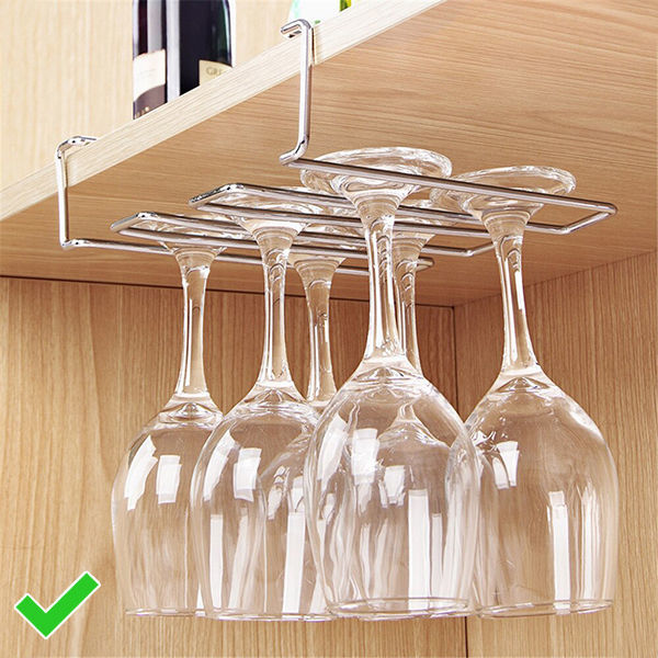 Пожалуй, самая незаметная и самая нелепая ошибка. Затея однозначно опасная: тонкое стекло бокала легко задеть толстыми керамическими кружками, которые мы, кстати, не советуем покупать. Рискуете и посуды лишиться, и получить травму. Есть эстетичный и оригинальный выход. Купите подвесной держатель для бокалов. Его можно закрепить под любой полкой или просто на стене над раковиной. Теперь на кухне все в порядке!