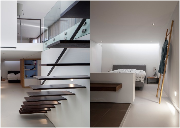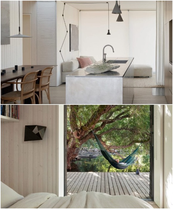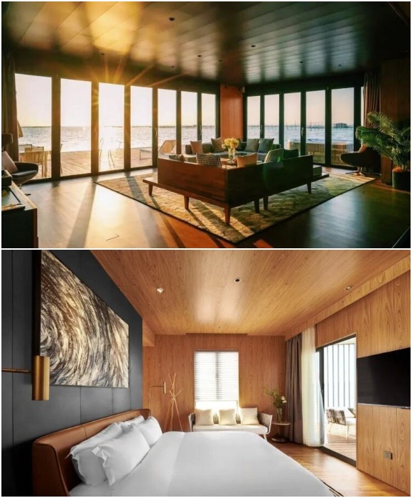 В подводных спальнях ничто не может нарушить сон, ведь там нет даже крошечных иллюминаторов (Амстердам, Нидерланды). Поскольку плавучий дом находится в черте города, строить двухэтажные объекты нецелесообразно и проблематично, поэтому было решено спрятать две спальни вместе с ванными комнатами под водой. Такое распределение пространства помогло сэкономить место для организации гостиной, кухни и столовой, из которых открывается завораживающий вид на реку и другой берег.