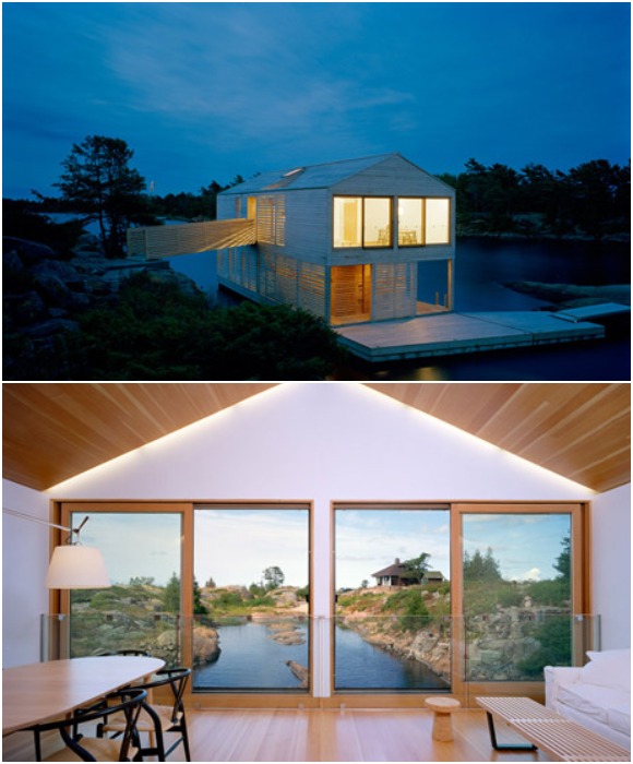 Но специалисты Vandeventer + Carlander Architects решили «перевернуть» строение, предоставив возможность жильцам, лежа в постели, любоваться водной гладью, а при желании, прямо с кровати нырнуть в озеро. Также стоит отметить, что планировка и оформление жилых и общих зон станет лучшим подарком для тех, кто мечтает поселиться на воде.