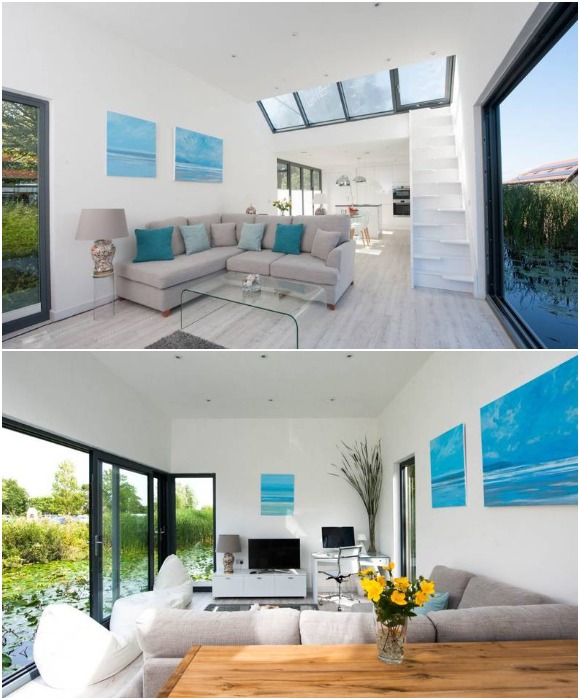 В итоге получился вполне симпатичный домик под названием Chichester (жилая часть собирается на заводе и за пару дней устанавливается). На первом этаже дома на воде обустроена гостиная, которая превращается в спальню, кухня-столовая и ванная комната. А вот оригинальная лестница ведет на террасу, которая находится на крыше дома и спрятана за распашной стеклянной дверью. Планируется обустройство полноценного второго уровня, но тогда домик получится значительно дороже.