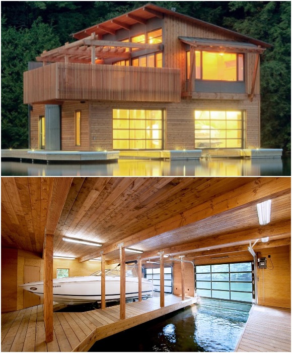 Кто из нас не мечтает жить на берегу озера или живописной бухты, хотя все прекрасно понимают, что места там для всех не хватит, да и участки в прибрежных зонах стоят непомерно дорого. Но находятся оригиналы, которые пошли еще дальше, они попросту поселились на воде. И если раньше таким строительством увлекались только очень богатые люди (плавучие города и деревни не в счет), то теперь все больше жителей планеты обращают внимание на неординарное альтернативное жилище. 1. Два в одном: эллинг и жилой дом на озере Мускока (Онтарио, Канада) Эллинг и жилой дом на озере Мускока пришвартован к живописному берегу (Онтарио, Канада). Если грамотно спроектировать плавучий дом, то можно иметь не только собственную крышу над головой, но и смело открывать свой бизнес. Именно так и поступил предприимчивый канадец, который сначала обзавелся эллингом с небольшой каютой для того, чтобы было, где жить первое время. Двухэтажный плавучий дом – идеальное место для жизни на лоне природы и для работы на свежем воздухе (озеро Мускока, Канада). Когда дела пошли в гору, на этой же плавучей базе он заказал расширение и теперь у него двухэтажный дом. На первом этаже имеется два гаража для небольших катеров/моторных лодок, ремонтная мастерская, складское помещение, санузел с душевой, а также три палубы, две из которых прекрасно подойдут для отдыха. Жилые апартаменты порадуют простором, прекрасными видами из окна и натуральной отделкой (озеро Мускока, Канада). Эффектная внешняя лестница приведет на второй этаж, где обустроены жилые апартаменты с гостиной, спальней, кухней, баром-столовой, благоустроенной ванной комнатой, балконом и большой открытой террасой. 2. Плавучая морская дача Haixi вместе с подворьем в Южно-Китайском море (Китай) Плавучая морская дача Haixi вместе с подворьем в одной из бухт Южно-Китайского моря (Haixi, Дуншань). Незатейливый эксперимент двух друзей вылился в грандиозный проект, который им удалось реализовать неподалеку одного из островов округа Дуншань (Китай). Молодые люди всегда мечтали проводить время на рыбалке, наслаждаясь морским воздухом, тишиной, красотой и пивом. В один прекрасный момент у них родилась идея построить плавучую дачу, которую можно было бы пришвартовать в местном порту. Настоящий отдых и расслабление в окружении воды и морских обитателей (Haixi, Дуншань). Молодые настолько увлеклись проектом, и соорудили таких габаритов платформу, которую никак нельзя было пристроит на пристани или в порту. Тогда им пришлось адаптировать проект под установку в открытом море, вернее сказать, среди большой бухты. Обустроив полноценный дом площадью 56 кв. м вместе с настоящее подворьем на мелководье небольшого залива, они отбуксировали морское «поместье» на расстояние 500 метров от берега. Как стало известно авторам Novate.ru, молодые люди вместе с друзьями проводят на плавучей даче Haixi выходные и отпуска, наслаждаясь рыбалкой, свежим воздухом, морским бризом и пивом, как и мечтали ранее. Примечательно: На понтонной платформе можно отправиться и в морское путешествие, только буксир нужно будет нанимать. А вот, чтобы удержать свои владения на одном месте, пришлось устанавливать 16 якорей весом по 1 тонне каждый. 3. Плавучий мини-дом в Сиэтле (США) Плавучий дом Portage Bay является личной резиденцией Стефана, нового соучредителя студии DIAA (Сиэтл, США). | Фото: dezeen.co