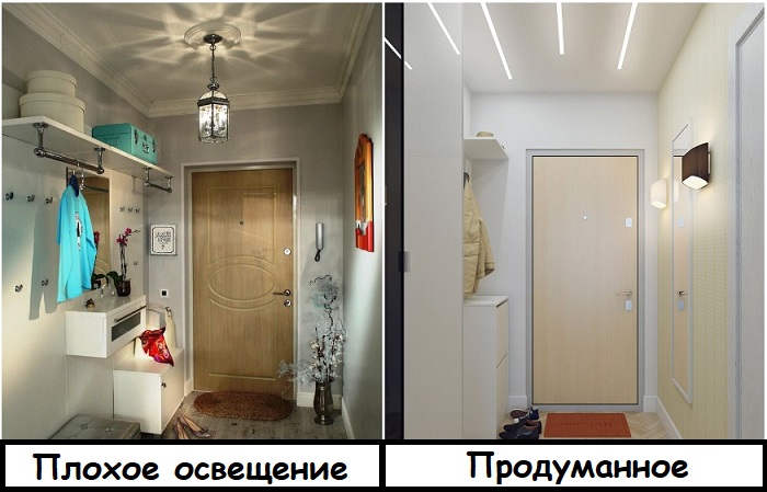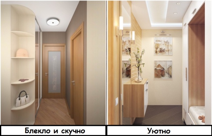 Если вы заходите в квартиру, но возникает впечатление, что очутились в кладовке, значит, люстра не справляется с возложенными на нее обязанностями. А может, и в без того тесной прихожей темные стены, что еще больше усугубляет ситуацию. Решить эту проблему просто – нужно перекрасить стены и заменить светильники. Запомните: если коридор маленький или узкий, светлые стены являются не прихотью, а жизненно важной необходимостью. Если вам не нравится белый цвет, обратитесь за помощью к персиковому, бежевому, нежно-голубому, пудровому, светло-серому – выбор очень большой, все зависит от ваших пожеланий.