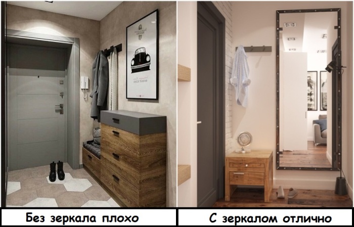 Так как построить новую прихожую не представляется возможным, нужно использовать разнообразные интерьерные хитрости для визуального корректирования пространства. Самый распространенный прием – зеркала. Кроме своей основной функции – демонстрации отражения – они также зрительно расширяют помещение. Можно сделать ход конем и оформить зеркальным полотном всю стену. Подобные изделия делают на заказ в некоторых мастерских. Также при покупке мебели старайтесь отдавать предпочтение шкафам и комодам с зеркальными поверхностями – они будут отражать свет, и тем самым сделают прихожую гораздо уютнее и гостеприимнее.