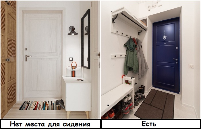 Кстати, о пуфике. Он присутствует в прихожей далеко не всегда. Если хозяева квартиры считают, что в комнате и без того мало места, они ограничиваются крючками для одежды и маленькой тумбочкой. А ведь очень важно иметь в коридоре удобное место для сидения. Согласитесь, гораздо удобнее надевать обувь, расположившись на стуле или пуфике, чем приседать на корточки, чтобы завязать шнурки, или держаться за стену, пытаясь попасть в туфли. Не игнорируйте этот предмет мебели, ведь он является залогом вашего личного комфорта. Можете отдать предпочтение не пуфику, а деревянной скамейке, маленькой табуретке, сиденье на тумбочке или прямо в шкафу – самое главное, чтобы вам было удобно. Даже в самой крохотной прихожей можно найти свободное место для такого предмета, и мы советуем не игнорировать этот момент.
