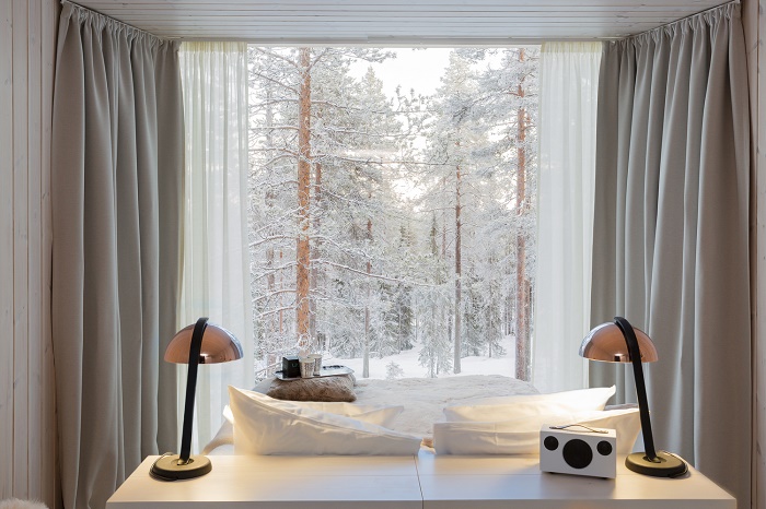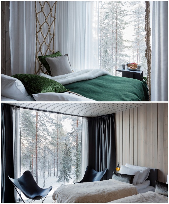 Интерьер спальных комнат в представительских Люксах, состоящих из двух спаренных шале (Arctic TreeHouse, Финляндия).