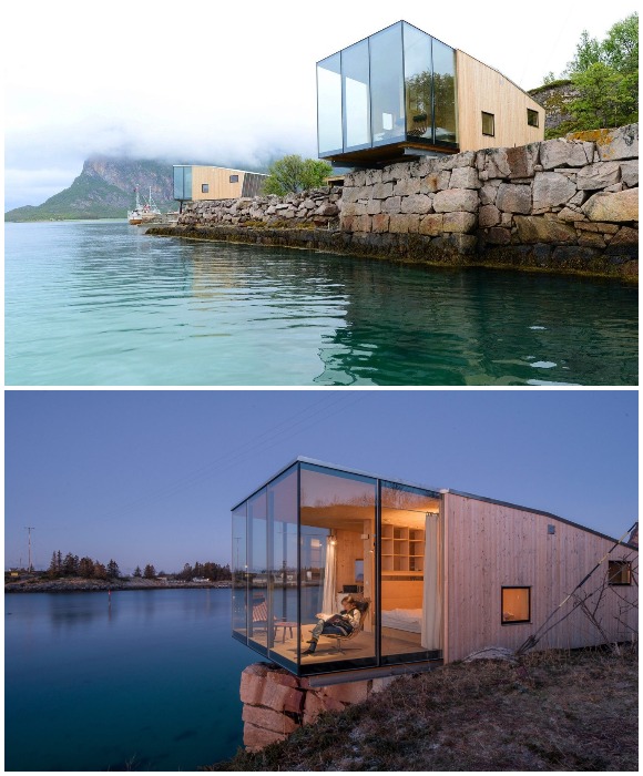 Деревянные домики, установленные на скалистом берегу острова, станут идеальным местом для расслабления и уединенного отдыха (Manshausen Sea Cabins, Норвегия).