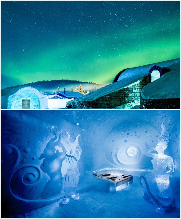Ну а пока лед, взятый из реки Торне, не превратился в воду и снова не оправился путешествовать по реке, уникальный арт-объект принимает всех желающих провести пару-тройку дней в настоящих ледяных дворцах и снежных пещерах, наслаждаясь первозданной красотой природы и Северным сиянием, которое в зимнюю пору здесь частый гость.