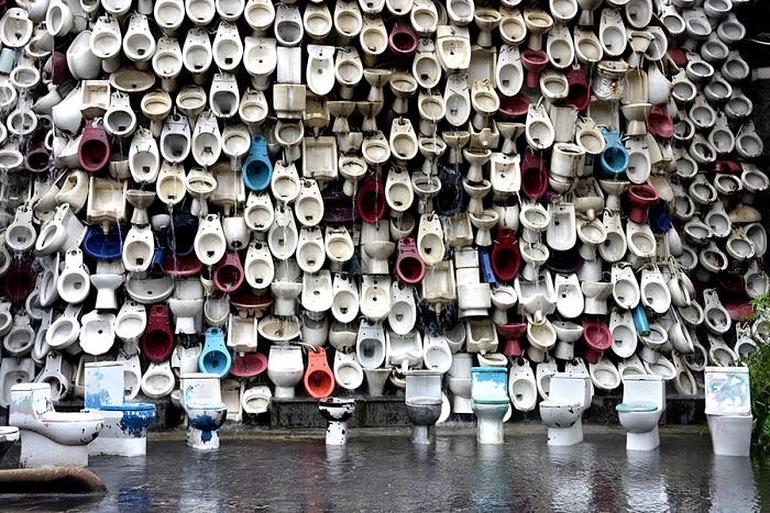 Необычная инсталляция периметром сто метров и высотой в пять метров была создана китайским художником Шу Юном по случаю проведения фестиваля керамики и фарфора, который проходит в Фошане. Этот город известен своими производствами фарфоровых изделий. Помимо унитазов в качестве материала для арт-объекта использовались раковины, биде и писсуары. Более того, каждый элемент инсталляции подключён к водопроводу. И оценки её также неоднозначны: местным жителям он не очень нравится, зато экологи - напротив, оказались в восторге, а всё потому что в объекте применялись только бракованные изделия местных фабрик и пришедшая в негодность сантехника. То есть, автор, по сути, разработал уникальный способ утилизации унитазов и раковин без создания свалок.
