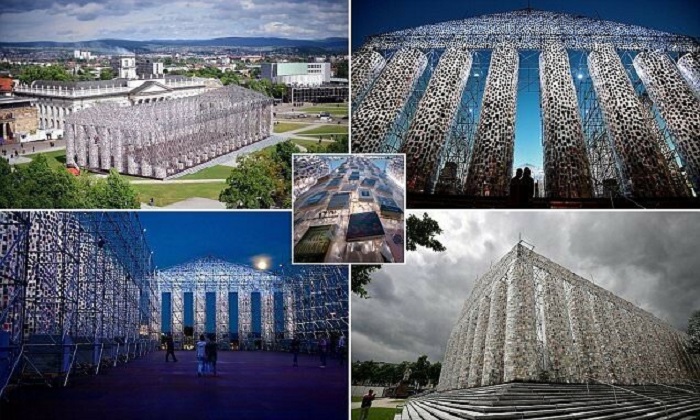 «Книжный Парфенон» создала аргентинская художница Марта Минухин, в рамках выставки Documenta 14. Арт-объект представлял собой копию известного афинского храма Парфенона, которые были сделан из весьма специфического материала. Так, на металлический каркас закрепили 100 тысяч книг, которые когда-либо оказывались в списках запрещённых в разных странах мира. Инсталляция была временной, поэтому после демонтажа автор позволила разобрать книги всем желающим. Примечательно и место, где она выставлялась: именно на этой площади в тридцатых годах прошлого столетия при Гитлере сжигались тысячи книг, запрещённых тогда в Третьем рейхе.