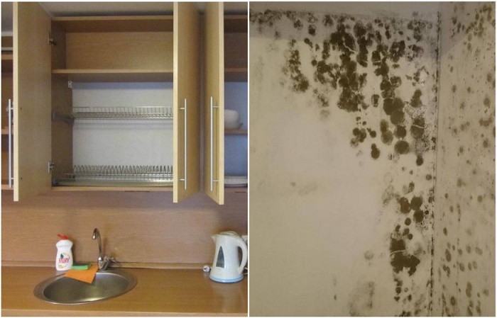 Наверняка вы хотя бы раз сталкивались с такой проблемой. Плесень появляется из-за сырости, а потому ваша главная задача – держать шкаф в сухости и чистоте. Если вы уже обнаружили плесень, используйте специальную бытовую химию для ее устранения. А для профилактики обязательно обработайте стенки и полки шкафа уксусом и поставьте открытую банку с содой или солью, чтобы она вбирала в себя лишнюю влагу.