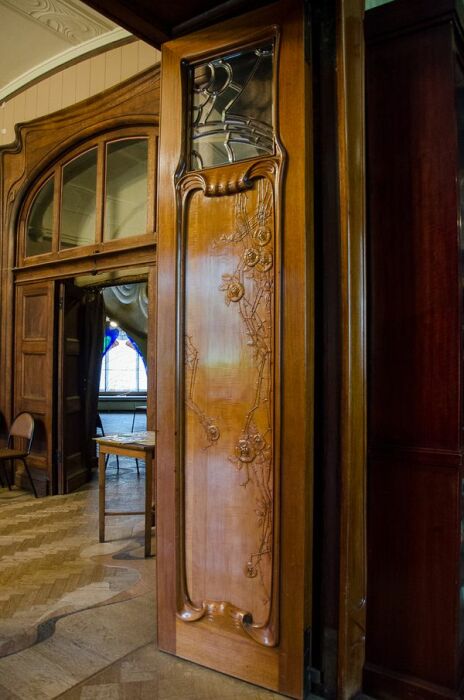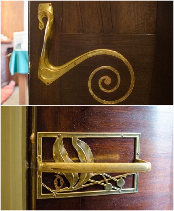 В особняке дверные ручки также являются произведением искусства (особняк С. П. Рябушинского, Москва). Находясь в прихожей, можно увидеть холл и несколько дверей, ведущих в кабинеты владельца (один предназначен был для работы, другой – для отдыха) и гостиную, граничащую со столовой. Две последних комнаты являются самыми роскошными и большими в особняке. Начиная с дубовой двери, украшенной стилизованными розами и ветками сыти папирусной, потолка с элегантной лепниной ручной работы, яркими фресками, и заканчивая живописными плафонами с желтыми хризантемами и улитками на стебле.