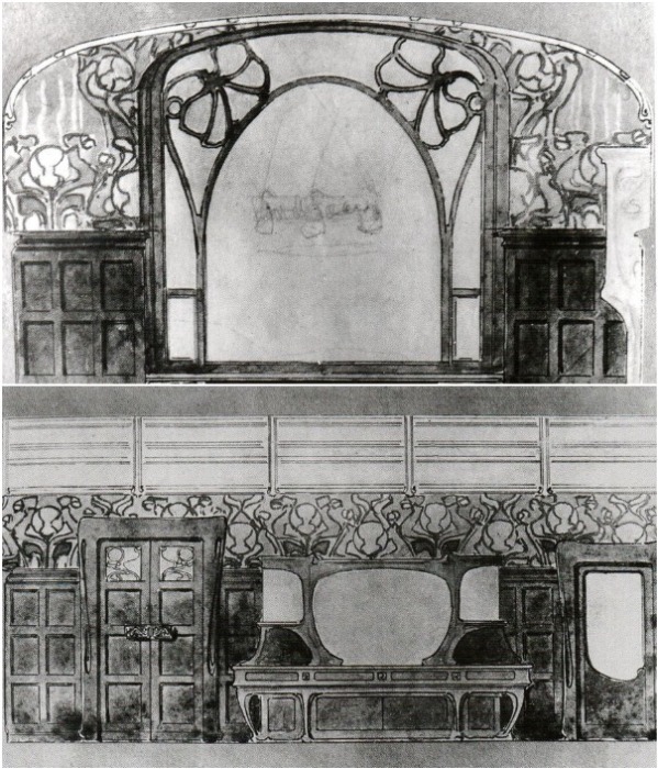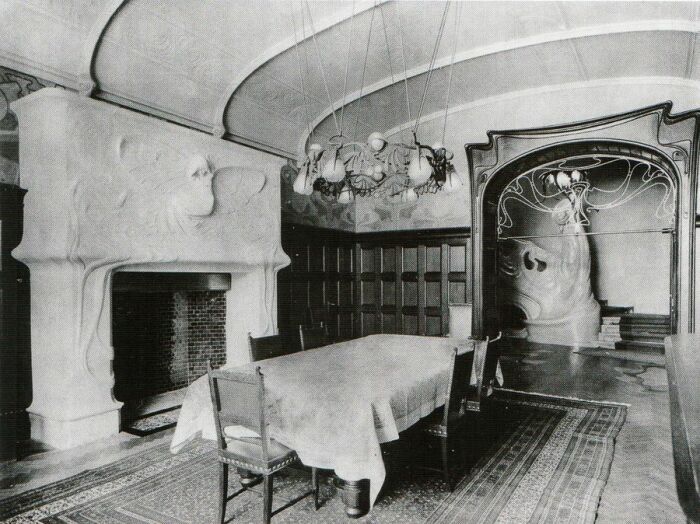 К сожалению, камин в столовой был демонтирован еще в начале 30-х годов прошлого века (особняк С. П. Рябушинского, Москва). | Фото: archialexeev.ru. Не менее впечатляло убранство столовой, которое много раз видоизменялось и даже потеряло самый прекрасный объект – беломраморный камин с горельефами, напоминающий триумфальную арку прямоугольной формы. Все эти залы были не лишены роскоши, в современном понимании этого слова. Дорогие виды древесины, используемые для отделки и мебели, эксклюзивные архитектурные элементы и предметы быта, разработанные самим Шехтелем, произведения искусства и много е другое. Благодаря продуманному до мелочей оформлению, обстановка особняка отличается особым стилем и новаторством, которые тонко подчеркивают высокий статус владельца.