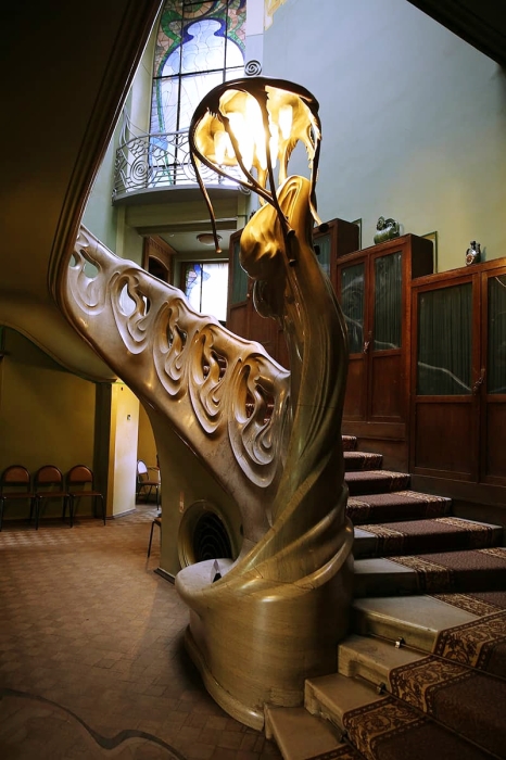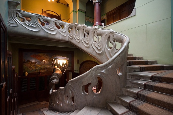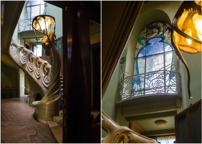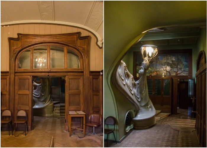 Футуристическая парадная лестница – самый эффектный архитектурный элемент в особняке С. П. Рябушинского (Москва). | Фото: architecturalidea.com. Взять, к примеру, волнообразную парадную лестницу, которую разрабатывал сам автор проекта. Она по сей день является главным архитектурным элементом, отличающим этот особняк от всех остальных в Москве. Скульптурные формы, структура лестничного пролета и перил, материал и цвет, гармоничное сочетание оформления стен, потолка, витражей и даже дверных ручек позволили создать эффектный ансамбль, которым можно любоваться и изучать бесконечно. Хотелось бы обратить внимание и на технические внедрения, которые могли позволить лишь состоятельные люди. К ним относятся: лифты, один из которых (шкаф-лифт) использовался для доставки готовых блюд из кухни, находящейся в подвале здания. А также мраморная лестница, рядом с которой находится решетка, откуда поступает теплый воздух (такой себе прообраз конвектора).