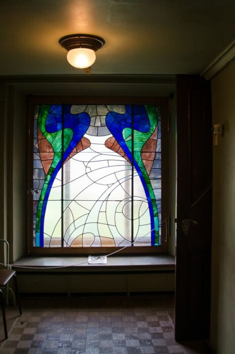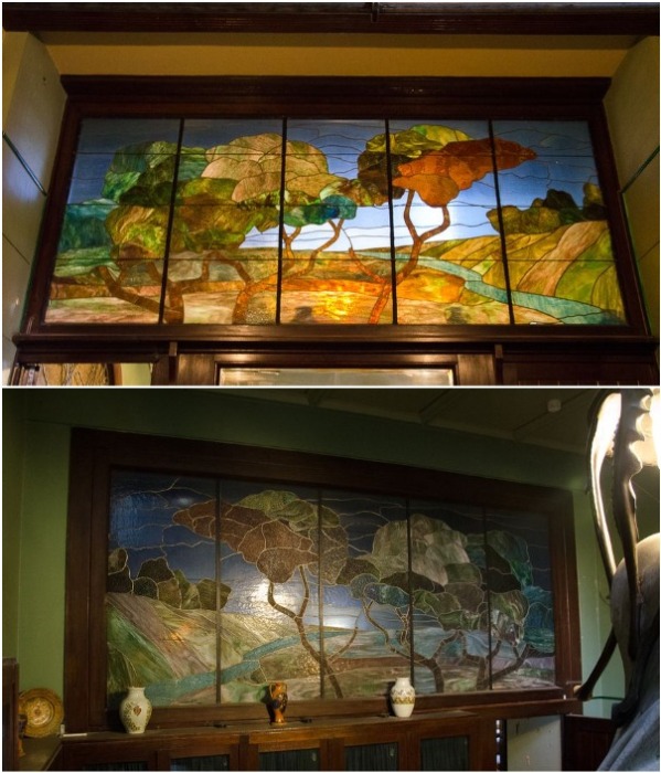 Витражная картина в течение дня меняет свет в зависимости от освещения (особняк С. П. Рябушинского, Москва).