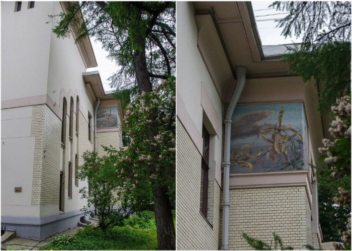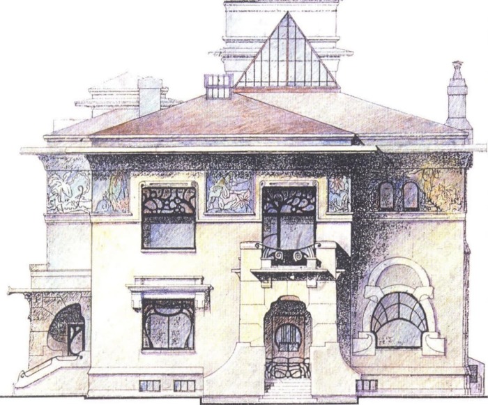 Карниз здания украшен яркой мозаикой с цветочными мотивами (особняк С. П. Рябушинского, Москва). Начнем с композиции объекта, который представляет собой кубической формы трехэтажное строение с ассиметричными выступами стен. Проектом предусмотрено сразу два впечатляющих парадных крыльца (с колоннами и арками), выходящих на юг и на запад. В отличие от традиционных зданий того времени, фасад особняка облицован лишь глазурованным кирпичом, без помпезных украшений и мраморных вставок. Благодаря тому, что окна расположены на разных уровнях и имеют разную конфигурацию и размеры, кажется, что здание гораздо выше, чем есть на самом деле. Заметными украшениями экстерьера являются лишь: широкий фриз, на котором красуется мозаика из орхидей и ирисов, консольные карнизы и аттик над венчающим карнизом.