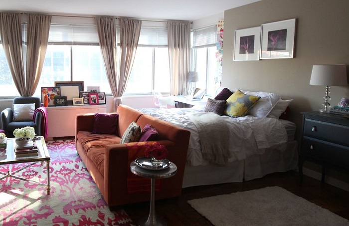 Следующий шаг – расположение дивана. Самое простое и эффективное в данной ситуации решение – развернуть его спинкой к кровати. Так вы сможете дистанцироваться от спального места – вам будет психологически казаться, что диван разделил комнату на гостиную и спальню. Есть и еще один плюс – если один из членов семьи захочет раньше лечь спать, он будет чувствовать себя уютно и комфортно, ведь на него не будут устремлены чужие взгляды.