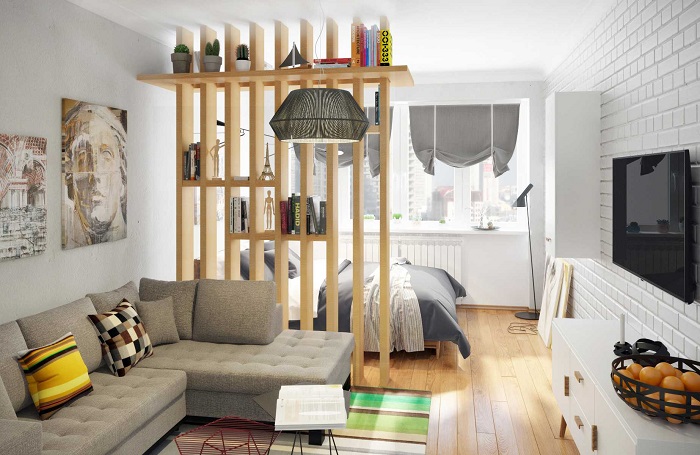 В последнее время в моду вошли перегородки, созданные из деревянных реек. За счет просветов между ними, конструкция выглядит легкой и воздушной, а также не препятствует попаданию естественного света во все части комнаты. Такая перегородка выгодна в однушке по двум причинам: во-первых, она не «съест» и без того маленькое пространство квартиры, а во-вторых, не утяжелит интерьер, как, например, глухая конструкция из гипсокартона.