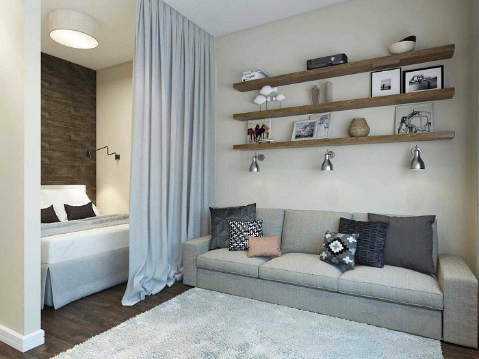 Наиболее простым и бюджетным способом разделить пространство будет штора. Да-да, вы все верно прочитали. Дизайнеры часто используют этот прием, если владельцы квартиры нуждаются в бюджетной перегородке или хотят, чтобы она была максимально легкой и невесомой. Как и в случае с выбором стеллажа, здесь нужно определиться, какая у вас цель. Если штора должна наглухо закрывать спальное место, не позволяя проникать в эту зону посторонним взглядам, тогда отдавайте предпочтение плотной ткани. Если же занавеска – просто способ визуального разделения пространства, тогда подойдет прозрачная тюль.