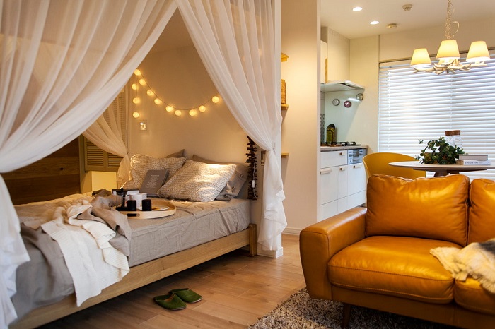 Давайте представим, что ваша квартира вас полностью устраивает в том виде, в котором она есть, и вы не хотите ставить стеллажи, перегородки, вешать шторы и проводить любые другие манипуляции для зонирования пространства. Но с другой стороны, мысль об отдельной зоне для сна и удобной кровати все-таки не покидает. В этом случае хорошим вариантом станет кровать с балдахином. Эта деталь, конечно, не сможет создать функциональные зоны в комнате, однако балдахин без проблем отделит спальное место от другого пространства квартиры. В результате, когда вы будете ложиться в постель, непременно ощутите спокойствие и уединение. Думаем, этого вполне достаточно для личного комфорта.