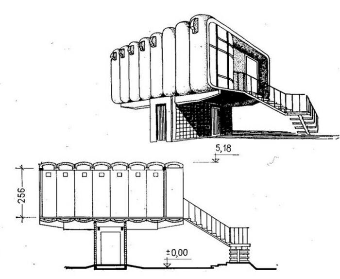 В СССР начало 60-х годов ознаменовало ударное строительство доступного жилья, в народе именуемого «хрущевками». Хотя в тот период умы архитекторов были заняты не только проектированием типовых пятиэтажек, порой случались неординарные эксперименты. Взять, к примеру, небольшой коттедж, в 1961 году появившийся в ленинградском спальном районе, который вызвал фурор сродни летающей тарелки с инопланетянами. Да это и понятно, мало того, что он имел фантастическую форму, так еще и построен был .из пластмассы. 1. С чего все начиналось Иллюстрация экспериментального жилого дома из пластмасс. | Фото: bigpicture.ru. К концу 50–х годов прошлого века в период стремительной урбанизации, захлестнувшей Страну советов, руководству пришлось разрабатывать программы по обеспечению новоиспеченных горожан жильем за счет государства. Если о сельских жителях мало кто заботился, как правило, деревенский народ возводил себе жилище самостоятельно, то в городе такая практика мало применялась. Массовое строительство дешевого жилья в народе именуемого как «хрущевки». Примечательно: В послевоенные годы СССР никак не мог позволить себе строительство качественного жилья в большом объеме, поэтому на вооружение был взят опыт экономичного домостроения Франции. Это означало, что началась застройка теми самыми «хрущевками», призванными обеспечить дешевым жильем большое количество людей в кратчайшие сроки. Типовым проектом предусматривался эксплуатационный срок многоквартирных домов с малогабаритными квартирами в 25 лет, за этот период планировалось полное обновление жилого фонда. Но, как известно, ничего не бывает настолько постоянным как временное. Несмотря на то, что с тех пор прошло уже 70 лет «временные» пятиэтажки до сих пор можно увидеть в старых жилых районах. Все то же французское домостроение вдохновило советских архитекторов не только на проектирование дешевых многоквартирных домов, но и на эксперименты с пластмассами в строительной индустрии. 2. Экспериментальный дом из пластмассы Пластмассовый жилой домик был установлен на цоколь, в котором спрятали инженерные коммуникации. | Фото: lj-editors.livejournal.com Уже к началу 1961 г. архитектор А. П. Щербенок и инженер Л. Г. Левинский разработали инновационный проект, призванный максимально сэкономить на строительстве индивидуальных жилых домов. Новаторы спроектировали небольшой коттедж, который устанавливался на бетонном каркасе цокольного этажа, а вот основным строительным материалом была выбрана пластмасса. Благодаря их стараниям в Ленинграде на улице Торжковской между двумя многоквартирными домами под номером 24 появился первый и единственный индивидуальный пластиковый коттедж, формы которого напоминали космический объект. План-чертеж пластмассового дома, разработанный архитектором А. П. Щербеноком и инженером Л. Г. Левинским. | Фото: back-in-ussr.com. Разработчики преследовали единственную цель – изучение эксплуатационных показателей пластика в условиях, максимально приближенных к жизни. Они не ставили задачу заселения в него людей, в доме-будущего планировали организовать исследовательскую лабораторию. Тем не менее его появление вызвало немалый ажиотаж, ведь в те времена архитектура спальных районов не баловала шедеврами, особенно с такими причудливыми формами. 3. Особенности конструкции и планировки пла