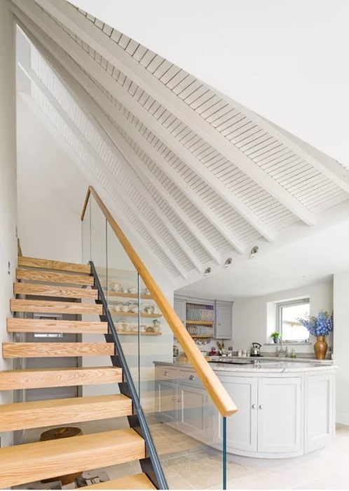 Спорим, вам уже хочется иметь подобное в вашем загородном доме? Витая крыша новой пристройки была решением, основанным на желании сохранить окно задней спальни при включении новой лестницы. Идея заключалась в том, чтобы сделать крышу, которая пропускала бы окно сзади и имела бы достаточную высоту для головы жильцов, когда они поднимаются по лестнице, именно отсюда возникла конструкция изгибающейся крыши. Крыша представляет собой стандартную конструкцию крыши с теплым настилом, потолочными балками и стропилами из хвойных пород, но, что необычно, каждая стропила имеет немного разный шаг, чтобы приспособиться к крутящемуся элементу. Вместо стандартных листов фанеры на стропилах и балках есть три слоя фанеры толщиной 6 мм, которые были склеены и заламинированы, образуя прочную изогнутую конструкцию, похожую на корпус корабля.