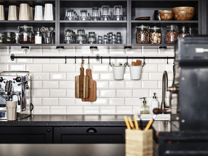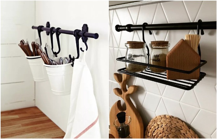 Главная цель аксессуара – повысить функциональность определенной зоны. На нем можно удобно разместить системы хранения в виде металлических корзинок или подстаканников, кухонные принадлежности (лопатки, венчики, половники) и даже декор, например, собственноручно выращенные пряные травы.