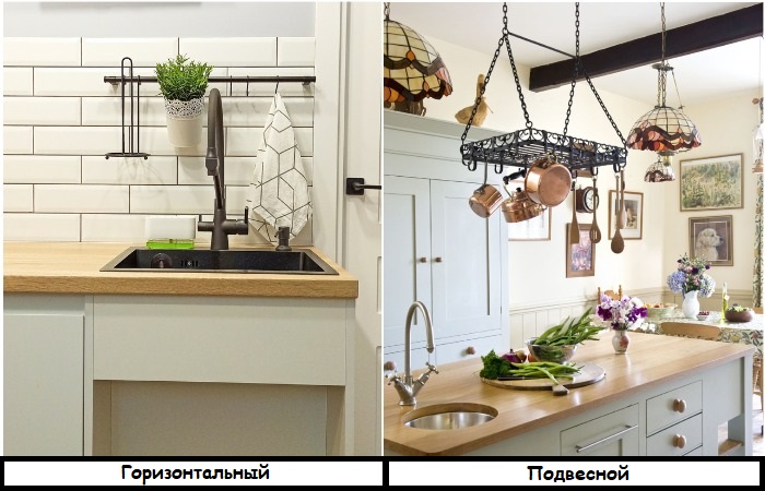 •горизонтальные – самая популярная разновидность рейлингов. Обычно их крепят на кухонный фартук или на боковую сторону нижнего шкафчика. По сути, это самая обычная полая труба, но благодаря крючкам и полкам, которые можно повесить на нее в нужном количестве, она превращается в практичную и функциональную систему хранения. Выбирайте держатель, необходимый по длине, или вешайте несколько штук в ряд;