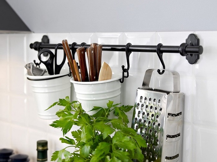 Помните, что при установки рейлингов не работает правило «больше – значит лучше». Поэтому не торопитесь покупать всевозможные аксессуары для держателей, а затем судорожно искать им применение. Лучше действовать от обратного. Для начала понаблюдайте за своим поведением во время готовки и уборки на кухне – какими предметами и продуктами вы пользуетесь чаще, чем другими? В идеале закрепить на рейлинге следует те кухонные девайсы, которыми вы пользуетесь ежедневно или хотя бы раз в три дня.