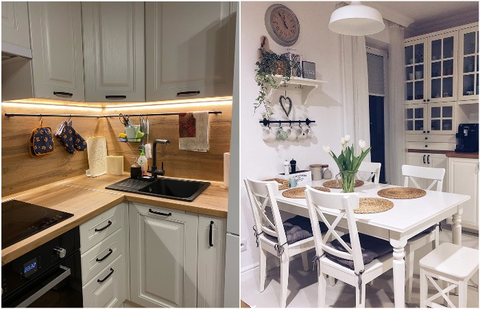 Если у вас Г-образная кухня и мойка расположена в углу, используйте такой же рейлинг. Он представляет собой все те же горизонтальные трубы, только соединенные друг с другом под прямым углом. Можете повесить и отдельные держатели – один справа, другой слева. Не менее выигрышно аксессуары будут смотреться на боковых стенках острова или шкафов – на них удобно вешать полотенца, прихватки и пр.