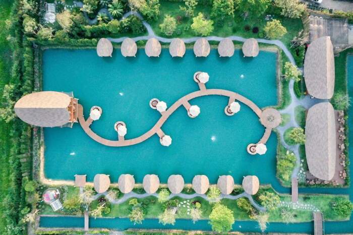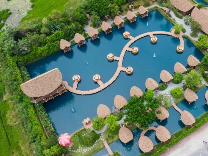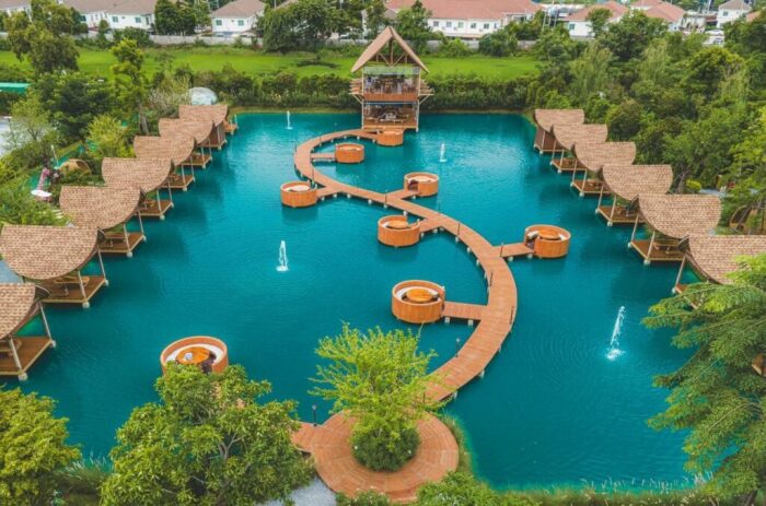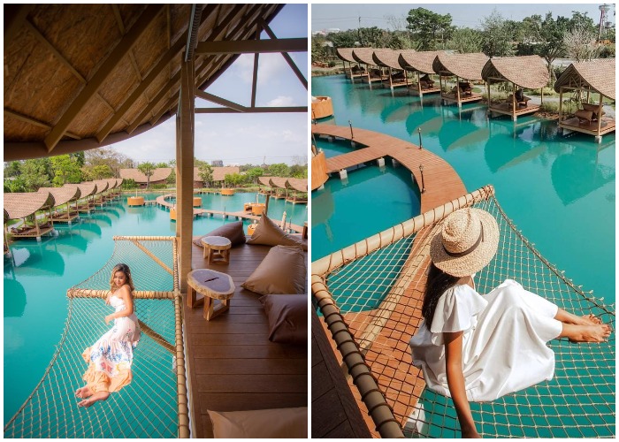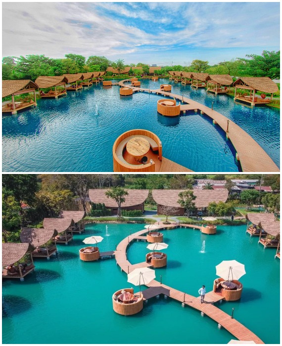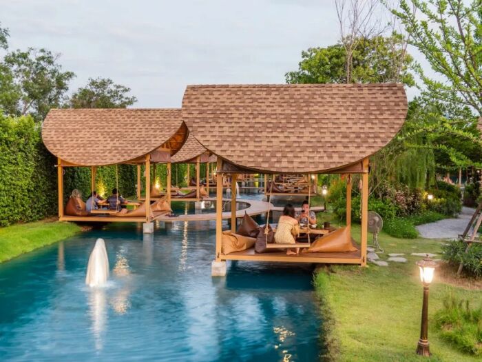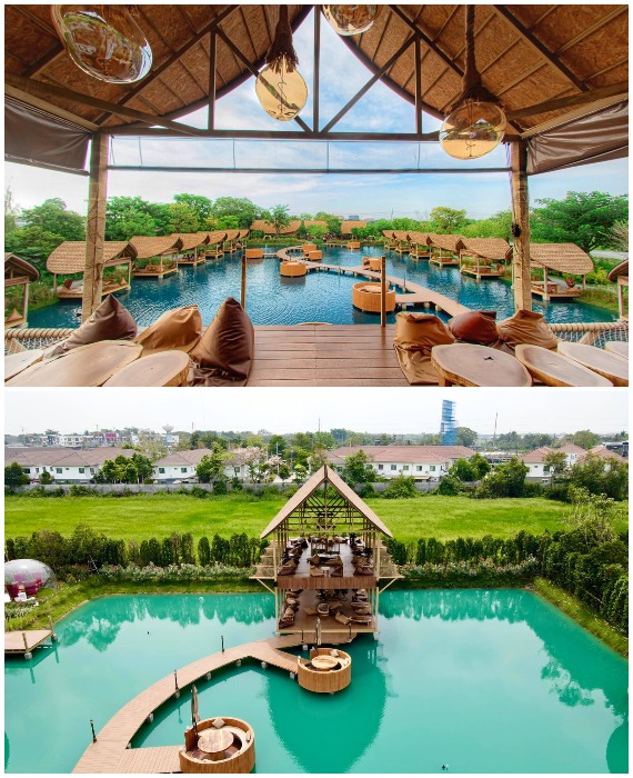 В наше время сложно удивить жителей крупных городов открытием кафе с летними площадками, но владельцу Bubble in the forest Cafe, проявившему чудеса изобретательности, это действительно удалось. Жителям Бангкока теперь не нужно тратить кучу денег и времени на поездку на Мальдивы, чтобы расслабиться с бокалом вина среди голубых вод Аравийского моря. Новое кафе, буквально парящее над нетронутыми водами с его балийскими бунгало и «плавающими» обеденными пространствами, поможет расслабиться, реально ощутить свежесть моря и насладиться экзотической красотой причудливого сада с секретом. «Пузырь в лесу»: мини-Мальдивы рядом с Бангкоком, где можно отдохнуть не хуже, чем на экзотических островах (Bubble in the forest Cafe, Тайвань). | Фото: thesmartlocal.co.th. Читайте также - Для того, чтобы поднять настроение и зарядиться положительной энергией на целый день рекомендуется смотреть красивые картинки, поделки и многое другое. Картинки симметрии посмотреть. Мальдивы и культовые бунгало над водой заставляют многих жаждать поездки на их райские пляжи, но не у всех и не всегда есть реальная возможность отправиться в путешествие. А вот у жителей Бангкока такая возможность появилась, они теперь без труда могут реализовать свою мечту, потратив всего час времени. И случилось это после открытия кафе с причудливым названием Bubble in the forest Cafe («Пузырь в лесу») в Накхонпатоме, провинции, изобилующей рисовыми полями, находящейся совсем недалеко от столицы Тайваня. В Bubble in the forest Cafe можно бесконечно любоваться голубыми водами пруда, отвлекаясь от стремительной жизни Бангкока. | Фото: pinoythaiyogo.com. Это заведения с первого дня стало очень популярным местом отдыха, куда устремились как любители пляжной романтики, так и те, кто гоняется за экзотическими фотографиями, чтобы удивить свежими снимками пользователей социальных сетей. Одни и другие действительно получат максимум удовольствия от незабываемого отдыха, смогут вдохнуть глоток свежего воздуха в окружении небольшого леса или среди вод импровизированного моря, как ни как организаторы старались создать очарование пляжей Мальдивских островов. Балийские бунгало установлены у берегов «лагуны» (Bubble in the forest Cafe, Тайвань). Извилистый мостик соединяет два берега пруда (Bubble in the forest Cafe, Тайвань). | Фото: artdesign.org.cn. Для того, чтобы посетители в полной мере могли расслабиться, территория кафе разделена три зоны. Первая зона – «морская», с заманчиво голубыми водами пруда, создающая атмосферу Мальдивских островов. Здесь посетители могут прогуляться по изогнутому деревянному мостику, соединяющему противоположные стороны берега, который слегка возвышается над идеально голубой водой или посидеть с чашечкой кофе, а может и стаканом сока в плавучем мини-бунгало. Эти очаровательные домики, созданные в балийском стиле, установлены прямо над водой у берегов «лагуны» и канала, который ее опоясывает. На берегу расположены два ряда бунгало на воде, где гости могут посидеть и расслабиться, насладиться красивыми пейзажами и почти морским бризом (Bubble in the forest Cafe, Тайвань). | Фото: thesmartlocal.co.th. В бунгало есть качели, чтобы гости могли получить разнообразные впечатления (Bubble in the forest Cafe, Тайвань). | Фото: pinoythaiyogo.com. Их оформление поможет окунуться в романтическую обстановку отдыха на берегу моря. Помимо натуральных материалов, из которых они сделаны, гостей ждет 
