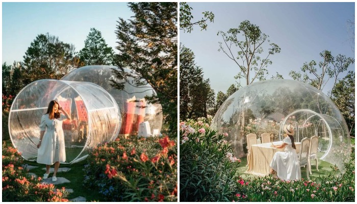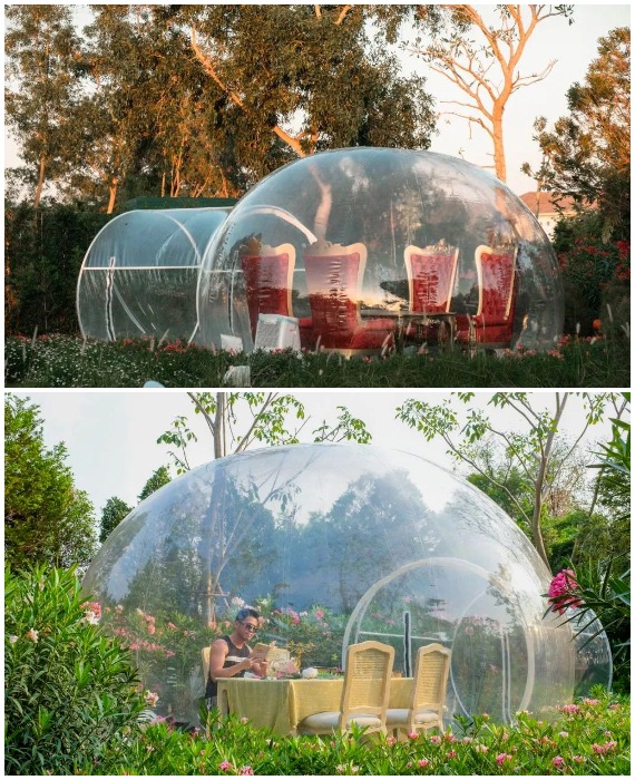 Прозрачные пузыри позволят очутиться в сказке среди благоухающего сада (Bubble in the forest Cafe. Тайвань).