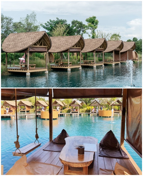 На берегу расположены два ряда бунгало на воде, где гости могут посидеть и расслабиться, насладиться красивыми пейзажами и почти морским бризом (Bubble in the forest Cafe, Тайвань). | Фото: thesmartlocal.co.th.