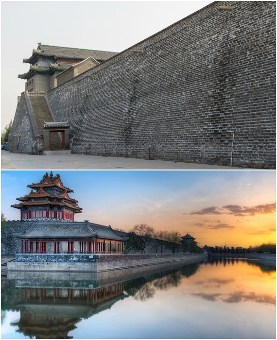 Удивительнейший императорский дворец легко можно назвать городом-замком, с учетом его площади и конструкции. Чтобы защитить покой императора и обеспечить ему безопасность, весь комплекс обнесен рвом шириной 52 метра, который и считался первой линией обороны. Дабы усилить неприступность, периметр комплекса обнесен крепостной стеной, высота которой достигает 10 метров. При этом по углам были предусмотрены сторожевые башни, откуда велось круглосуточное наблюдение за окрестностями. С каждой стороны Запретного города были сделаны укрепленные ворота, которые пересечь могли лишь избранные. Поскольку ворота выходят на каждую из сторон света они имеют и соответствующее название: на южной стороне – Меридианные или Полуденные ворота, на севере – Ворота божественной мощи, на востоке – Восточные ворота славы и на западе – Западные ворота славы.