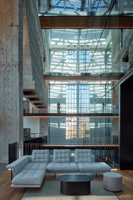 Замысловатые «воздушные» переходы соединяют разные уровни, являясь захватывающими дух смотровыми площадками, обеспечивающими обзор внутреннего пространства (BASE co-working center, Братислава).