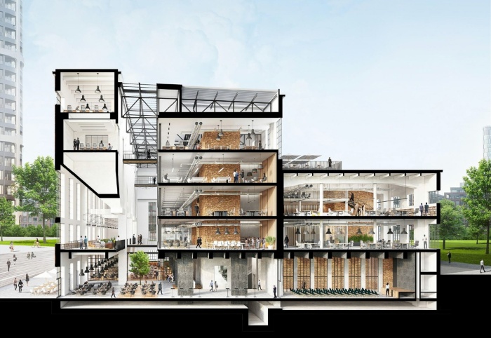 Новый комплекс после реконструкции является вполне современным зданием, в котором сохранились: кирпичная кладка, бетонные конструкции, впечатляющее потолочное оборудование в виде трех гигантских воронок, множество металлических элементов и большие окна промышленного типа. При этом внутри производственного пространства были добавлены стеклянные перегородки, позволившие разделить котельную и машинный зал на более мелкие зоны, не ограничивая обзор. Имеющиеся технические и стилистические детали органично вписались в новый дизайн, создавая новые функции, не теряя идентичность объекта.