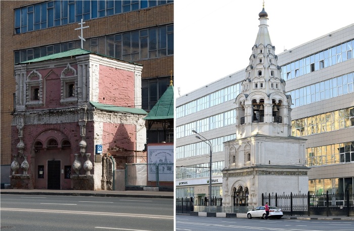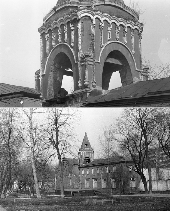 В таком состоянии была колокольня в 1990 году и как она выглядит после реставрации (Храм Рождества Пресвятой Богородицы в Бутырской слободе).